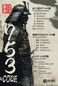 日本の武士道の心得に由来するものの、ポルトガル語から英語への2段階の翻訳を経ており、日本人には若干違和感を感じる言葉もあるかもしれませんが、本質的にはこれら全てを統合し日常を生きる上での指針とし、生活習慣化することで、健康で幸福な生き方に繋がるものです。